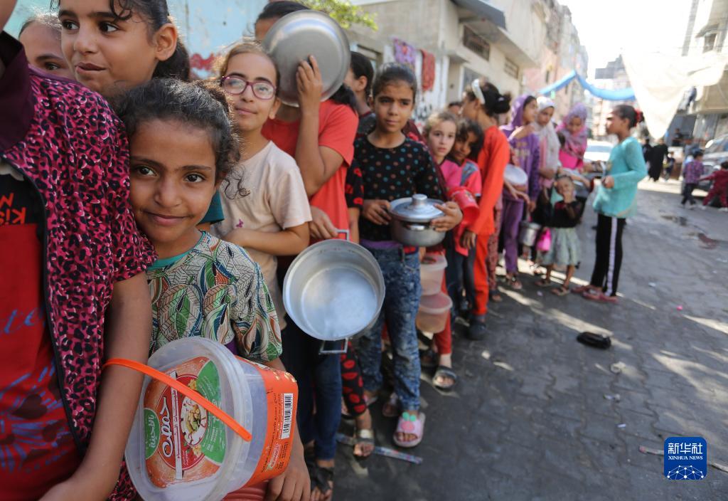 11月9日,在加沙地帶南部城市拉法,人們在一個(gè)臨時(shí)分發(fā)點(diǎn)排隊領(lǐng)取食物。