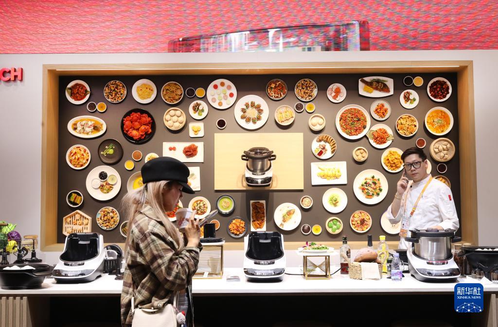 11月10日,在第六屆進(jìn)博會(huì )上,參觀(guān)者從一家廚房電器展臺的菜肴裝飾墻前走過(guò)。