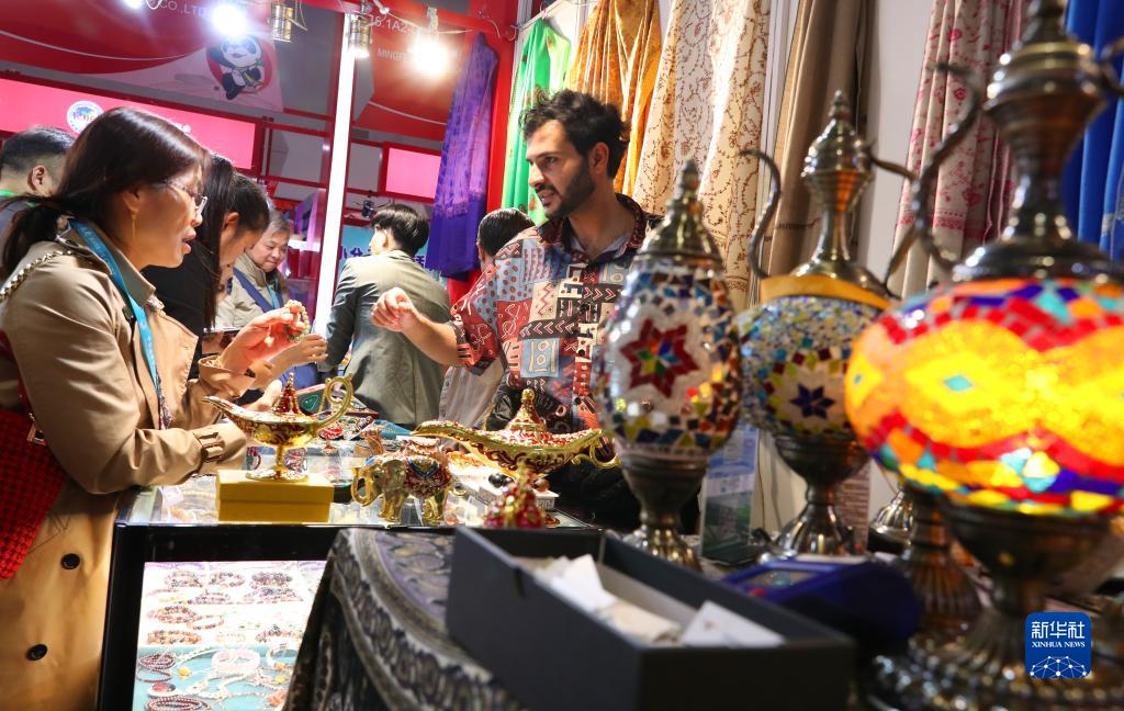 11月10日,在第六屆進(jìn)博會(huì )上,一名來(lái)自也門(mén)的展商(右)向觀(guān)眾介紹特色手工藝品。