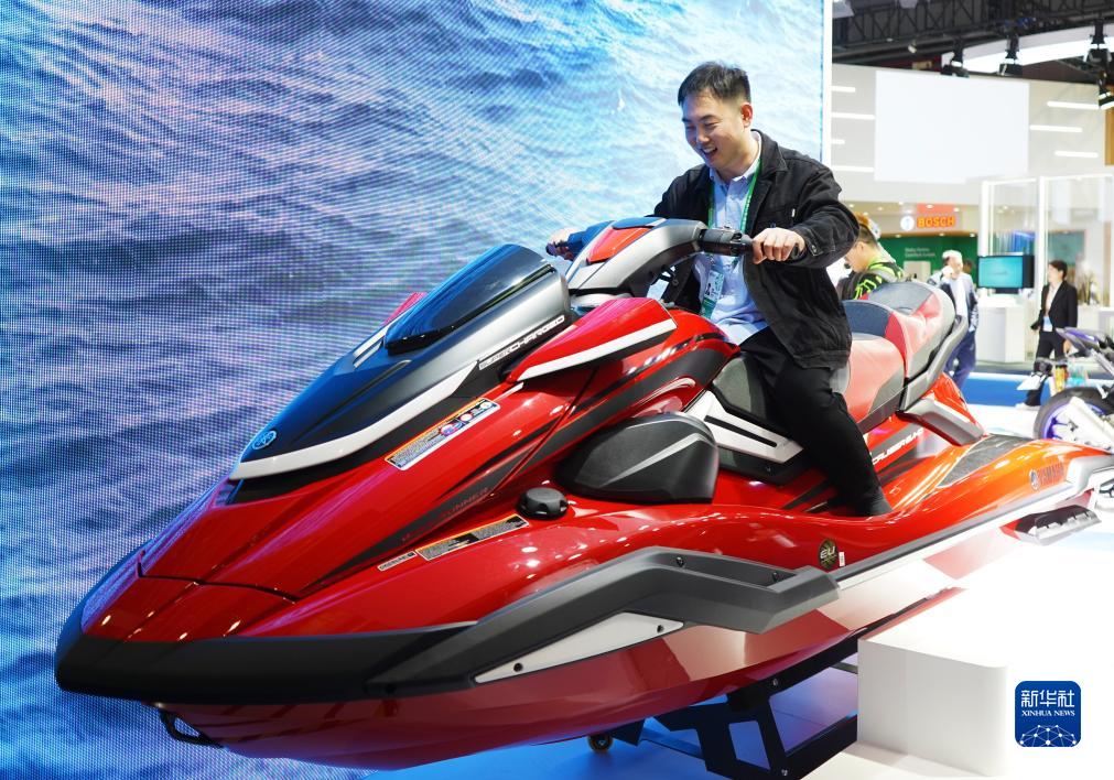 11月10日,在第六屆進(jìn)博會(huì )汽車(chē)展區雅馬哈展臺,觀(guān)眾體驗一款摩托艇。