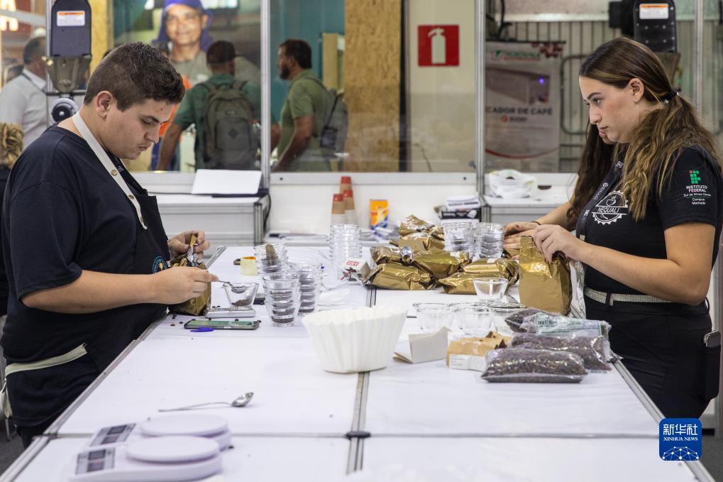 11月9日,在巴西貝洛奧里藏特舉行的咖啡周上,工作人員包裝咖啡。