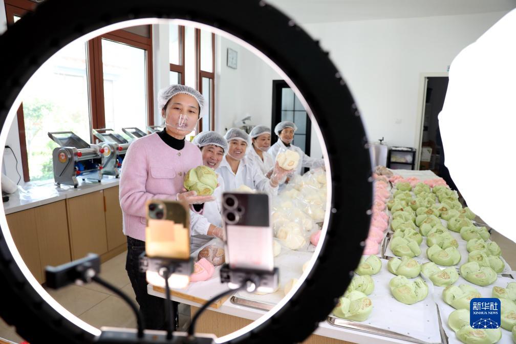 11月8日,山東省青島西海岸新區海青鎮共富電商直播基地,志愿者在直播售賣(mài)海青花饃。