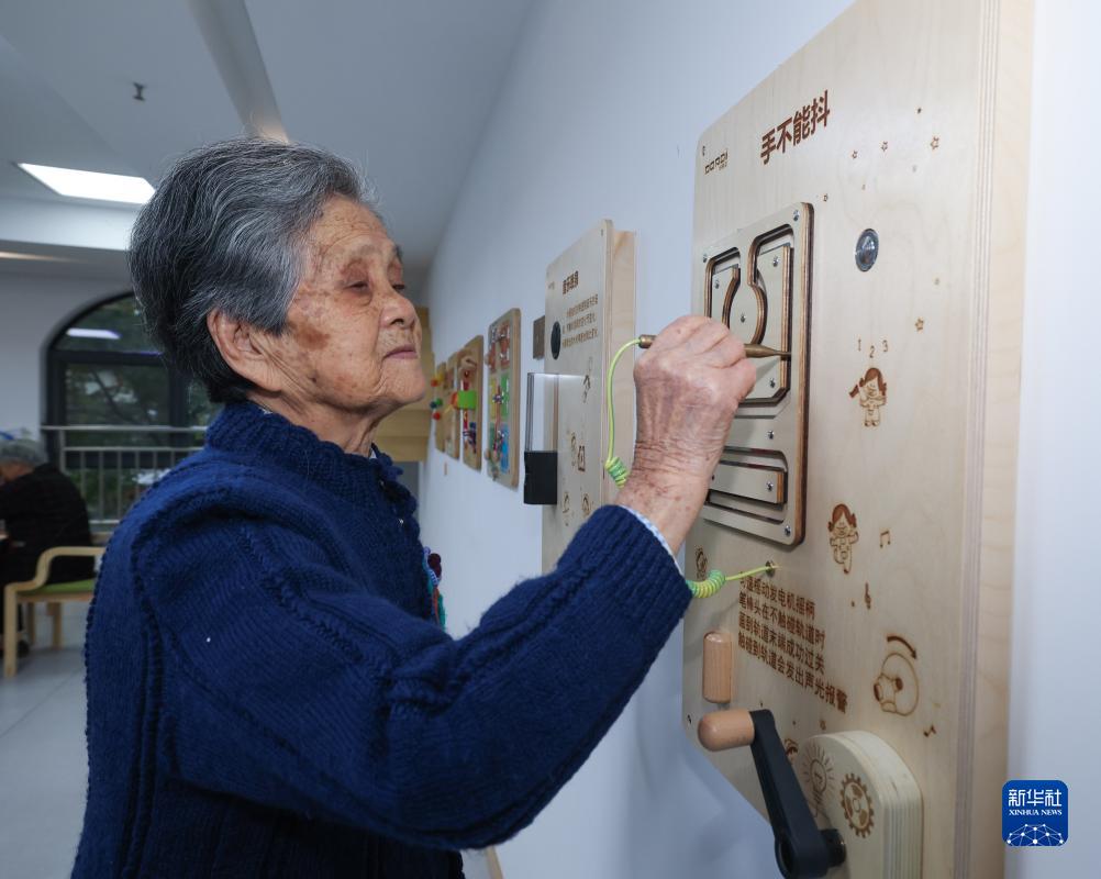 11月10日,在云和縣百齡幫鳳凰家園長(cháng)者養護中心的老年木玩活動(dòng)室內,一名91歲的老人在玩益智木玩。