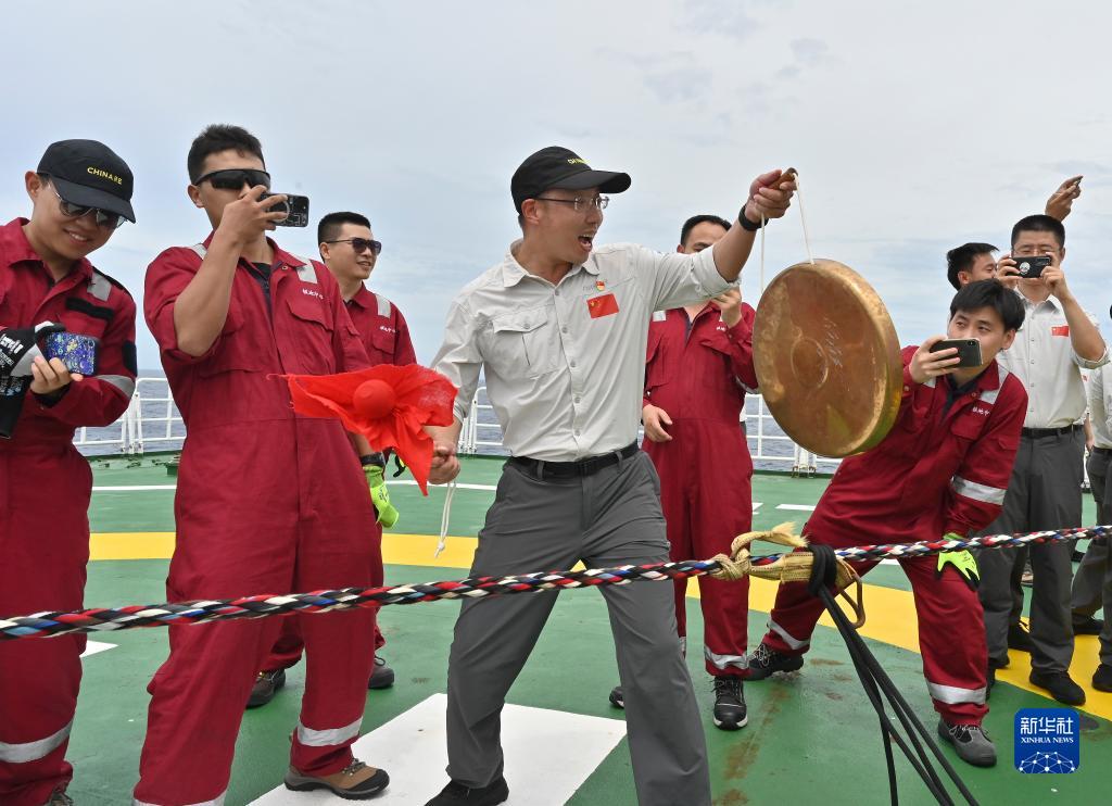 11月10日,中國第40次南極考察隊在“雪龍2”號上舉行穿越赤道紀念活動(dòng)。圖為考察隊副領(lǐng)隊魏福海敲鑼宣布拔河比賽開(kāi)始。