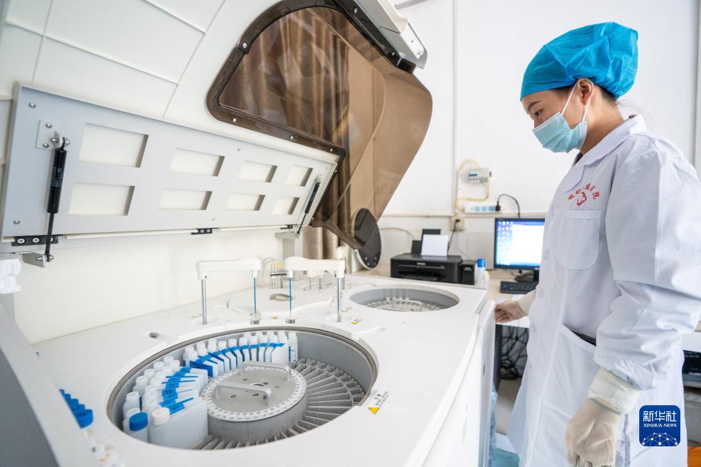 在畹町仁慈醫院,檢驗科的醫護人員在操作化學(xué)分析儀(10月29日攝)。