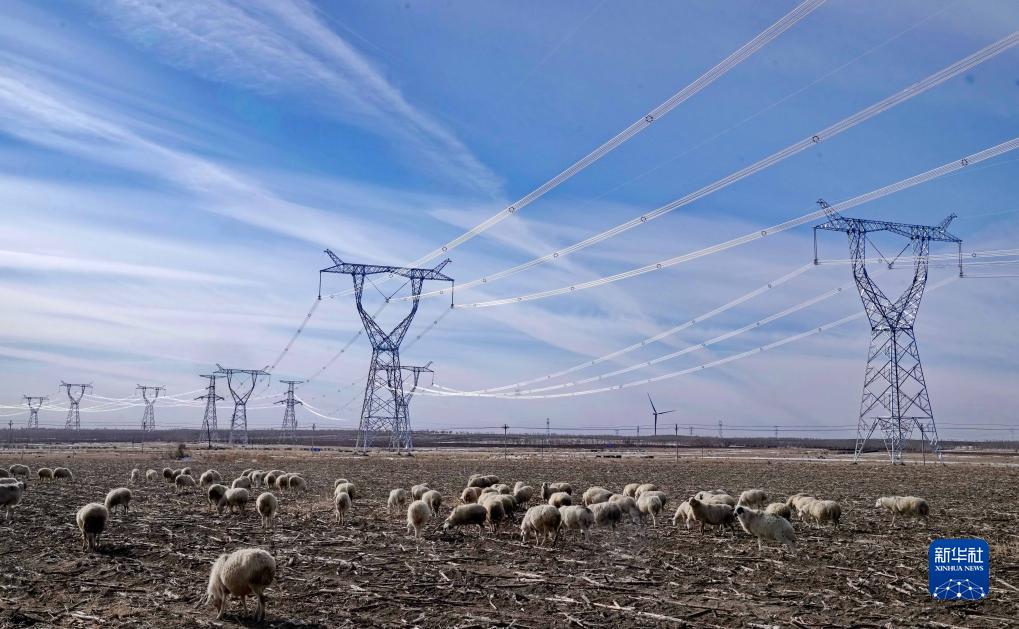 11月10日,一群羊在河北省康??h丹清河鄉境內的張北至勝利雙回1000千伏特高壓線(xiàn)路工程冀北段建設工地附近覓食。