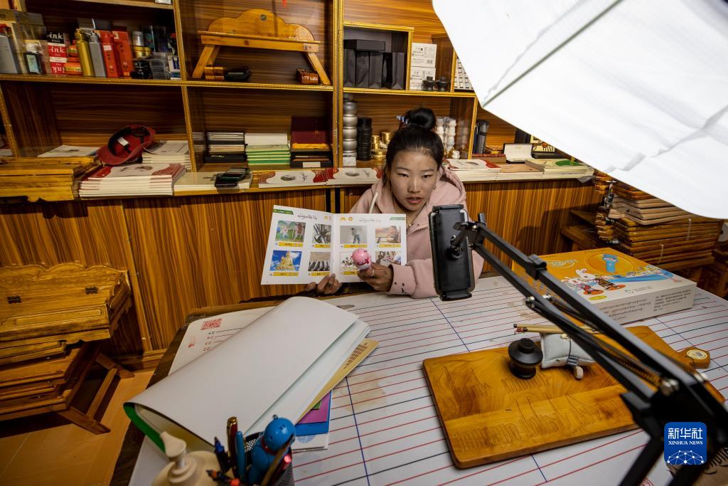 西藏拓崗文化傳播有限公司主播索朗德吉在直播銷(xiāo)售藏語(yǔ)學(xué)習文具(11月10日攝)。