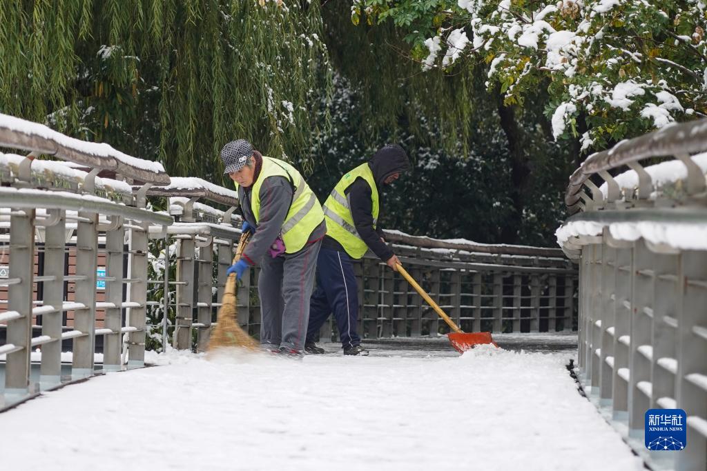 11月11日,園林工人在濟南泉城公園清掃積雪。