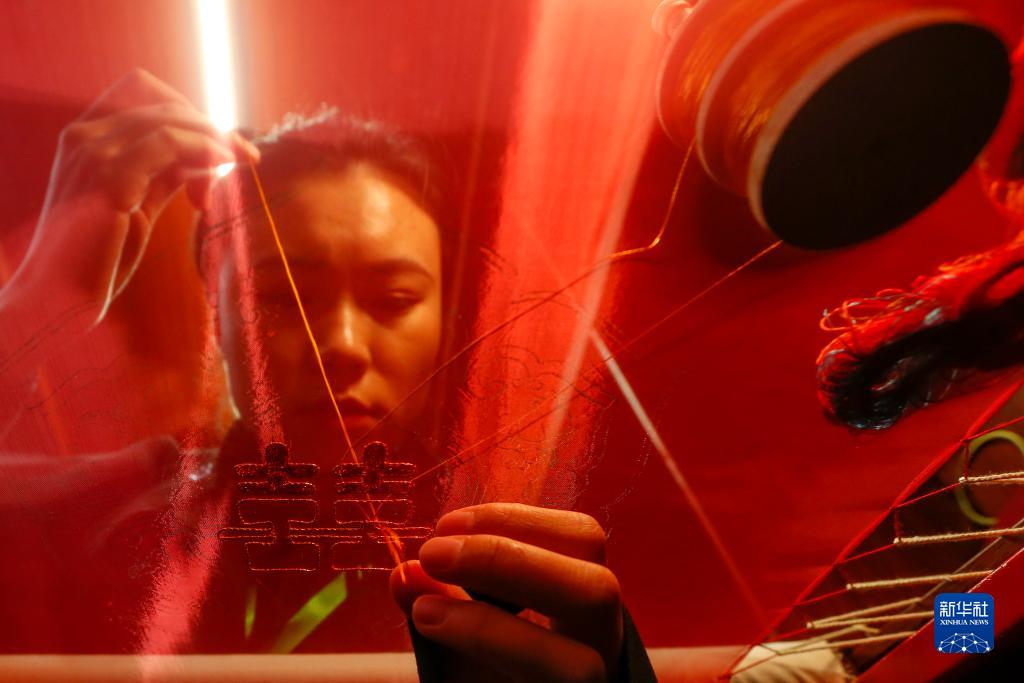 11月10日,參展人陳戴苗在第六屆中國非物質(zhì)文化遺產(chǎn)傳統技藝大展上展示“金銀彩繡”非遺傳統技藝。