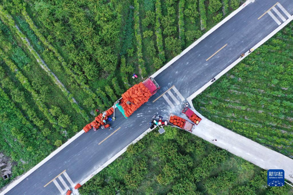 在貴州省龍里縣洗馬鎮臺上村,加工企業(yè)將收購的刺梨鮮果裝車(chē)(2021年8月18日攝,無(wú)人機照片)。