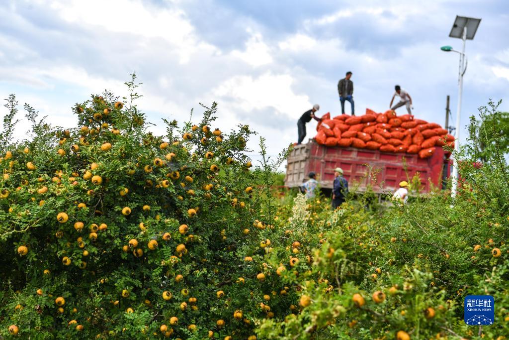 在貴州省龍里縣洗馬鎮臺上村,加工企業(yè)將收購的刺梨鮮果裝車(chē)(2021年8月18日攝,無(wú)人機照片)。