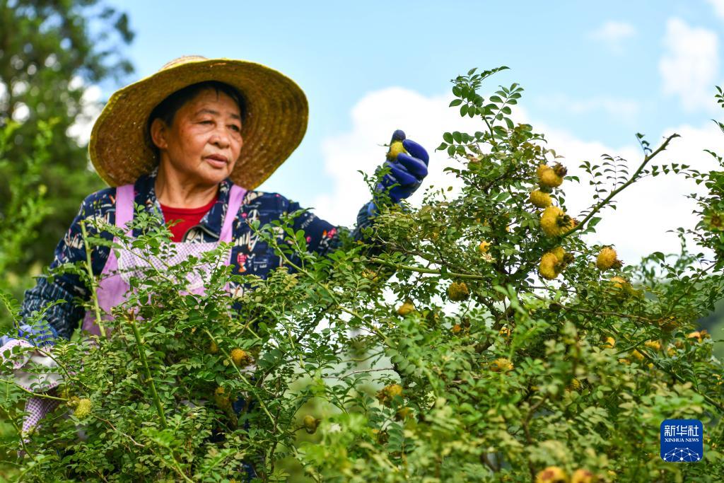 農民在貴州省龍里縣谷腳鎮高堡村采摘刺梨鮮果(2021年8月18日攝)。