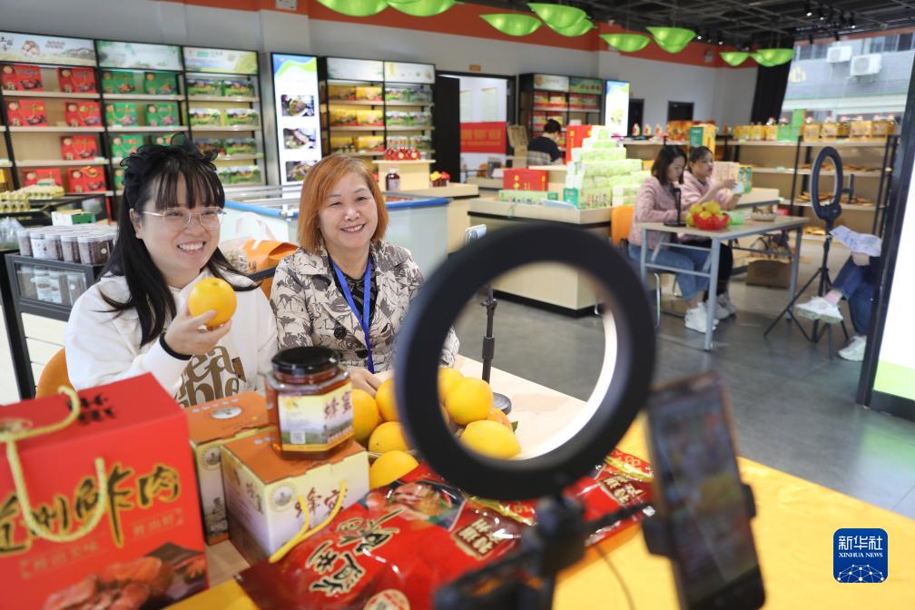 11月11日,在湖南省永州市道縣電子商務(wù)孵化中心,主播在網(wǎng)絡(luò )平臺上推廣當地農特產(chǎn)品。