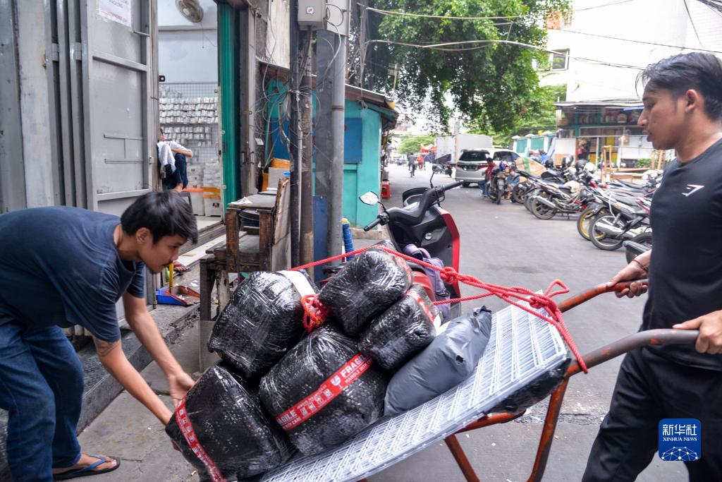 11月10日,在印度尼西亞雅加達,“美麗珍珠商店”員工在“雙十一”購物節期間搬運快遞包裹。