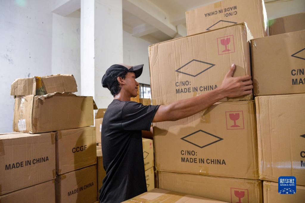 11月10日,在印度尼西亞雅加達,“美麗珍珠商店”員工在“雙十一”購物節期間搬運來(lái)自中國的貨品。