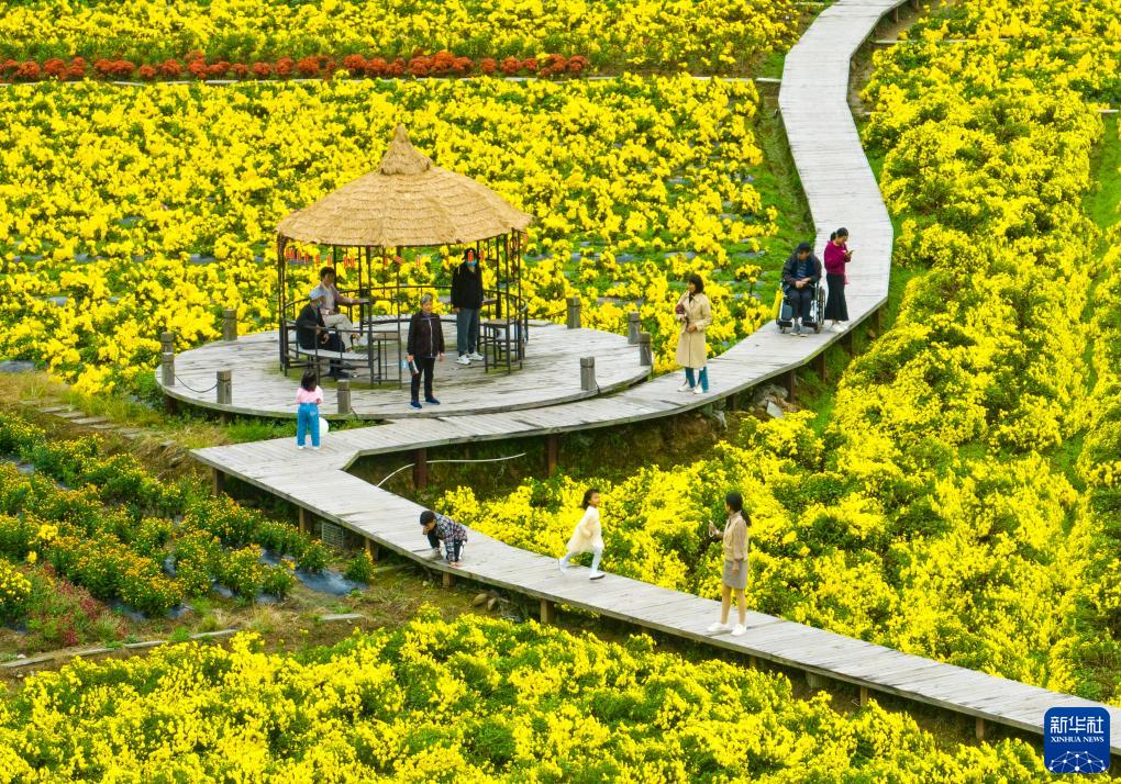 11月11日拍攝的在寧波市寧??h力洋鎮海頭村的菊花園中游玩賞花的游客(無(wú)人機照片)。