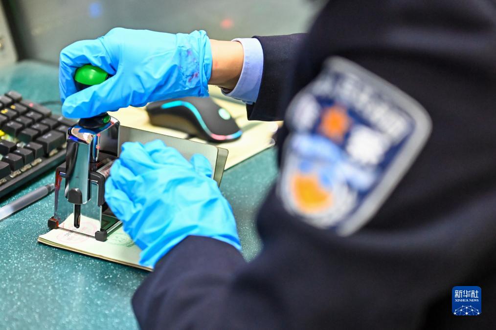 在新疆紅其拉甫口岸聯(lián)檢大廳,紅其拉甫邊檢站民警為出境旅客辦理邊檢手續(11月6日攝)。