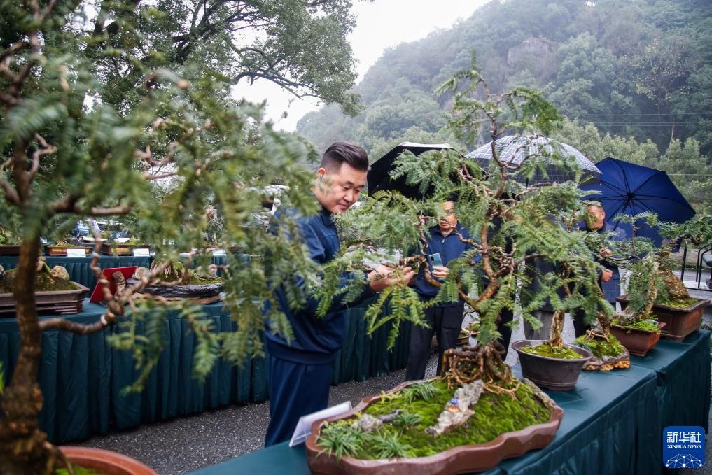 11月11日,在浙江省諸暨市東白湖鎮,香榧盆景愛(ài)好者、游客參觀(guān)香榧盆景展。
