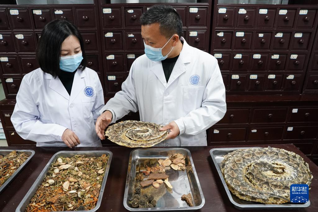 11月8日,在安徽省祁門(mén)蛇傷研究所,研究所所長(cháng)倪永松(右)與工作人員一起盤(pán)點(diǎn)蛇藥。