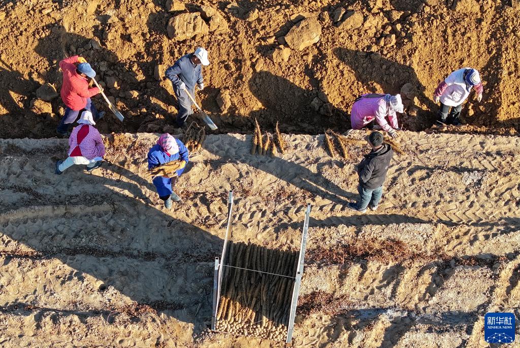 11月12日,在鄂托克前旗城川鎮章昂希里村的沙地農田,農民采收白玉山藥(無(wú)人機照片)。