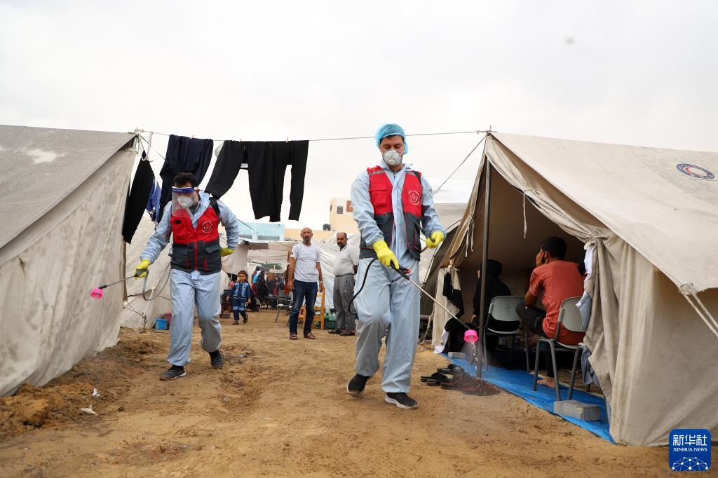 11月12日,工作人員在加沙地帶南部城市汗尤尼斯一處臨時(shí)難民營(yíng)噴灑消毒液。