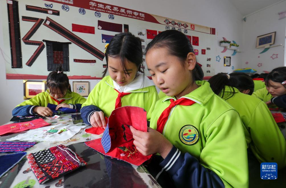 11月13日,在貴州省黔東南苗族侗族自治州施秉縣楊柳塘鎮中心小學(xué),學(xué)生在苗繡課堂學(xué)習刺繡。