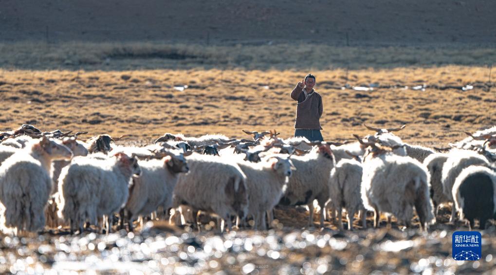 在西藏當雄縣納木湖鄉達布村的冬季放牧點(diǎn),云丹在放牧(11月10日攝)。