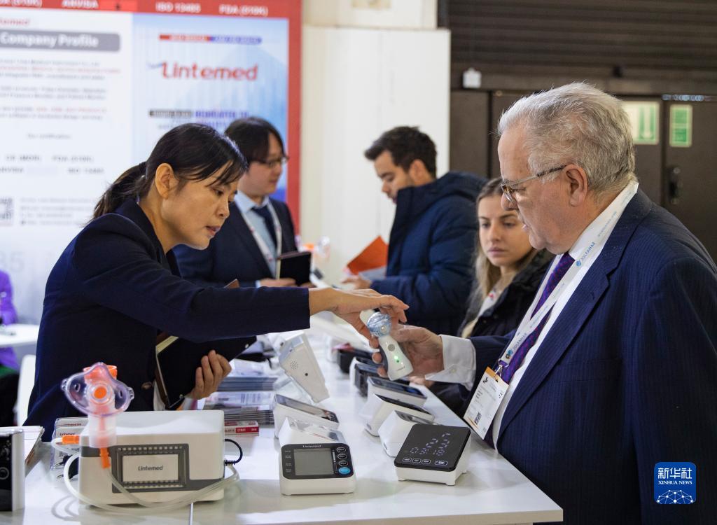 11月13日,在德國杜塞爾多夫國際醫療器械設備展,參觀(guān)者在凌特公司展位咨詢(xún)洽談。新華社記者 張帆 攝