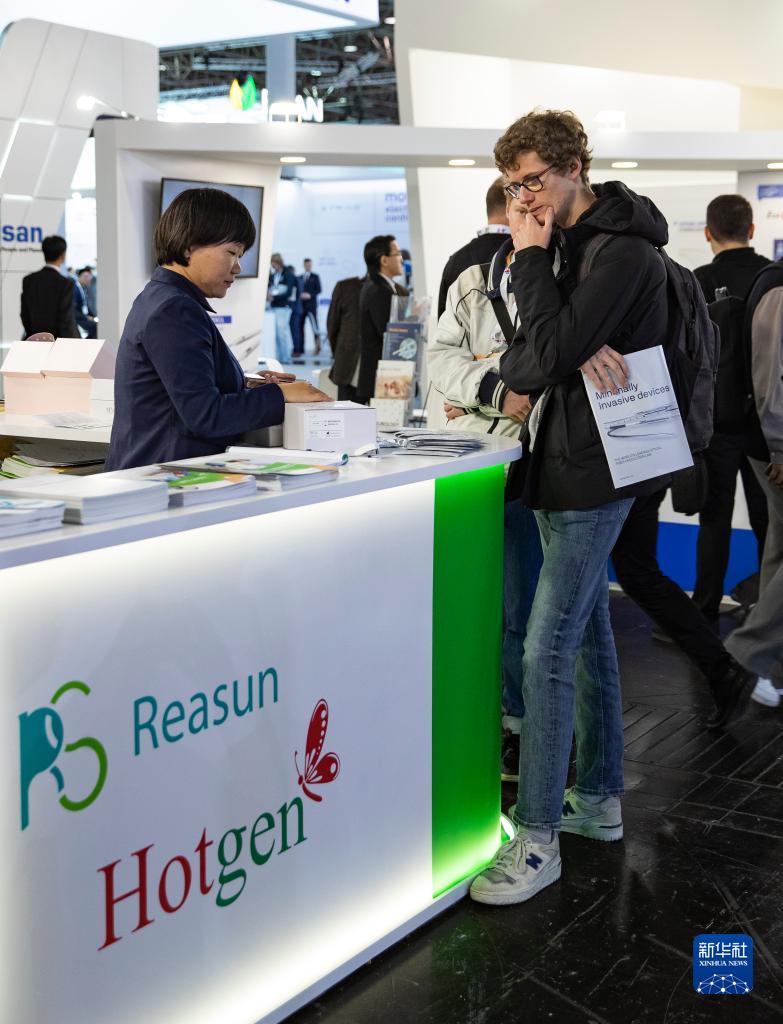 11月13日,在德國杜塞爾多夫國際醫療器械設備展,參觀(guān)者在熱景生物展位咨詢(xún)洽談。新華社記者 張帆 攝