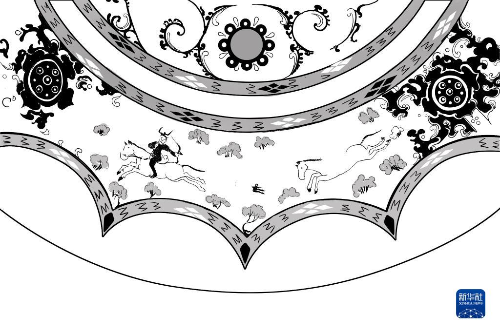 西漢彩繪人物車(chē)馬鏡局部“狩獵”圖案線(xiàn)稿圖。新華社發(fā) 李賀 繪制