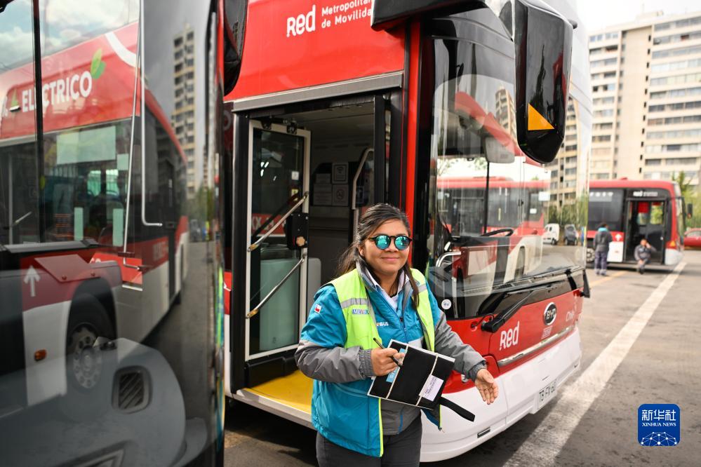 11月2日,在智利首都圣地亞哥,520路新能源公交車(chē)司機寶拉完成一個(gè)班次后回到總站。