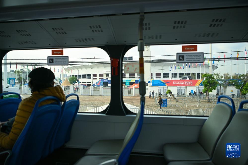 11月2日,在智利首都圣地亞哥,一輛520路新能源公交車(chē)經(jīng)過(guò)2023泛美運動(dòng)會(huì )主場(chǎng)館。