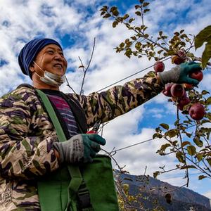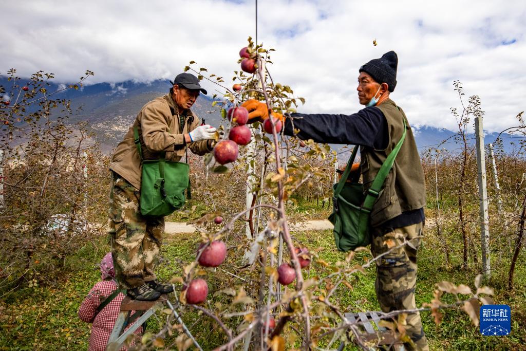 米林市羌納鄉西藏林芝現代蘋(píng)果標準化園區內,農民在采摘蘋(píng)果(11月13日攝)。