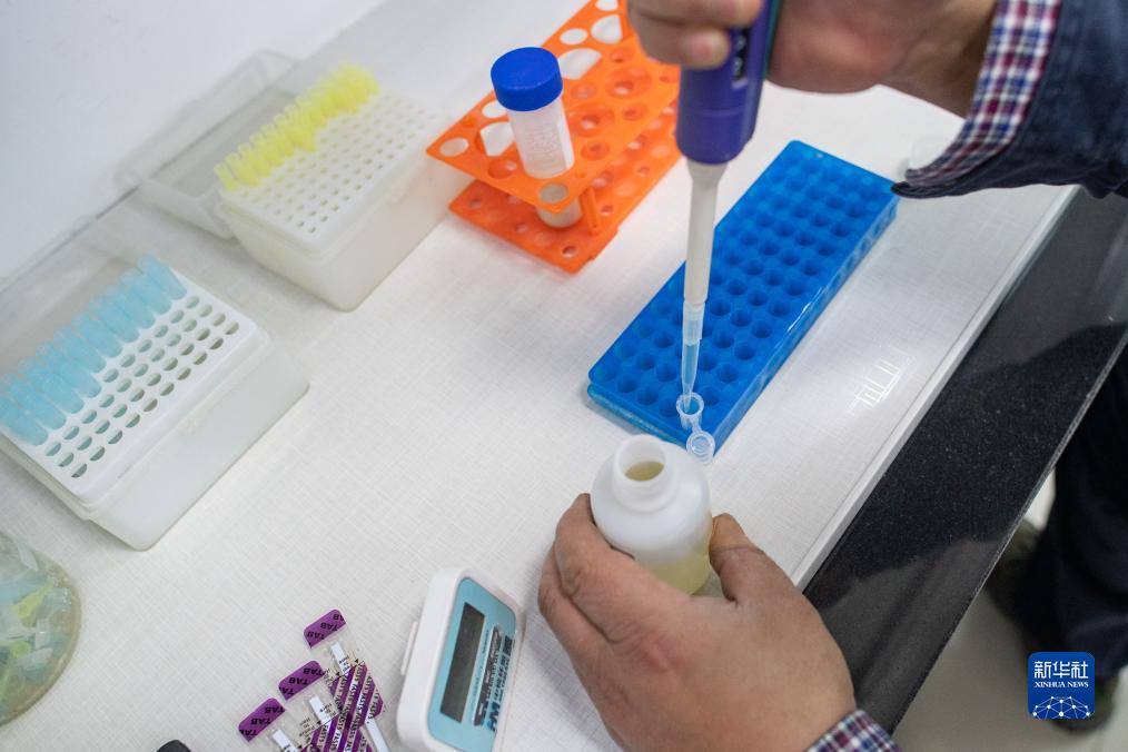 11月14日,在中儲糧仙桃直屬庫有限公司,工作人員在進(jìn)行稻谷黃曲霉毒素檢測。