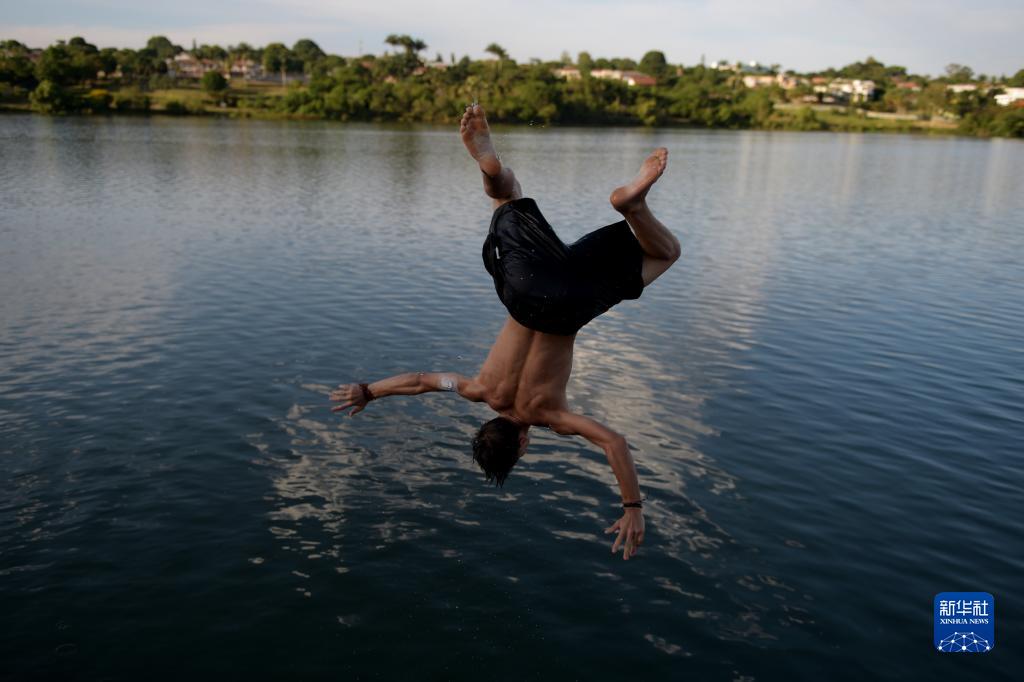 11月14日,在巴西首都巴西利亞,一名男子跳入帕拉諾阿湖消暑。