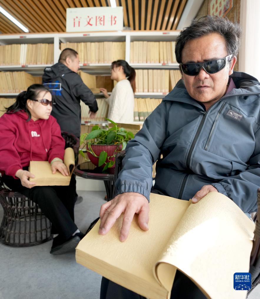 11月14日,在內蒙古烏拉特前旗圖書(shū)館視障閱覽室內,視障人士在“閱讀”盲文書(shū)籍。