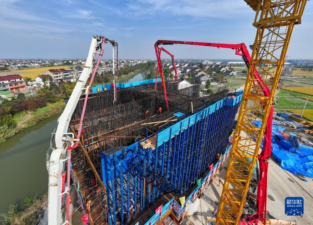 這是11月15日拍攝的滬渝蓉高鐵泰州段通泰揚特大橋跨如泰運河及X355縣道連續梁拱施工現場(chǎng)(無(wú)人機照片)。