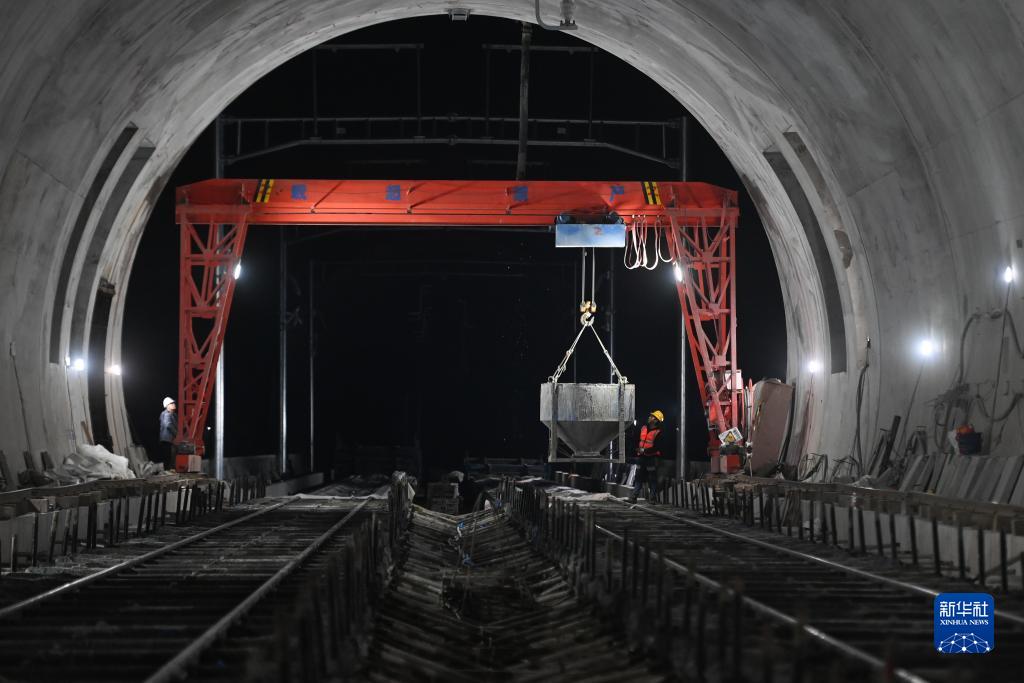 11月15日晚,中鐵十一局的建設者在杭衢鐵路(建衢段)天池山隧道無(wú)砟軌道澆筑施工現場(chǎng)作業(yè)。