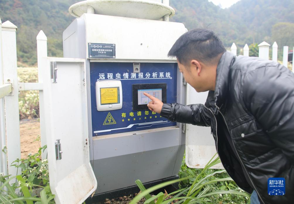 11月16日,歙縣深渡鎮定潭村黃山貢菊智慧農業(yè)示范基地負責人通過(guò)蟲(chóng)情測報分析設備查看病蟲(chóng)害情況。
