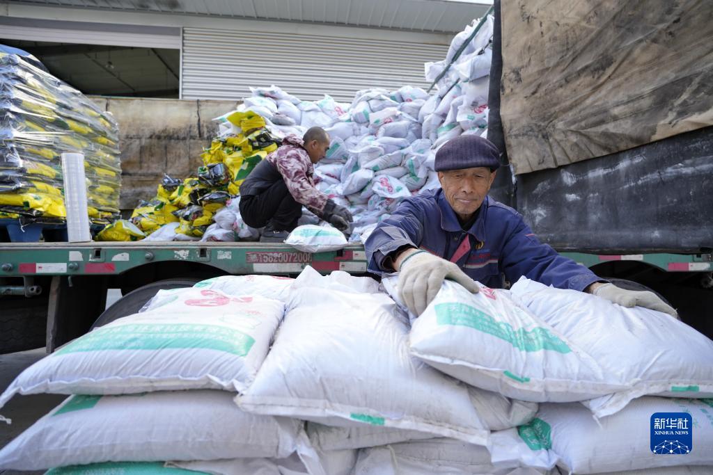 11月16日,在位于唐山市豐潤區的唐山公路港物流有限公司,工人在整理農資產(chǎn)品。