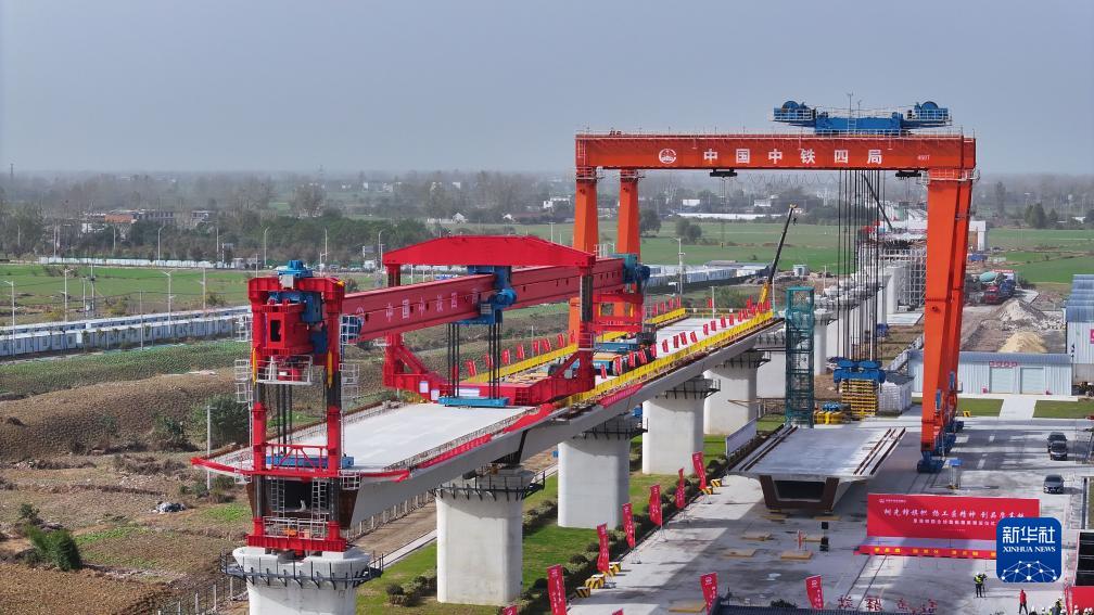 這是中鐵四局阜淮鐵路全線(xiàn)首榀箱梁架設現場(chǎng)(11月16日,無(wú)人機照片)。