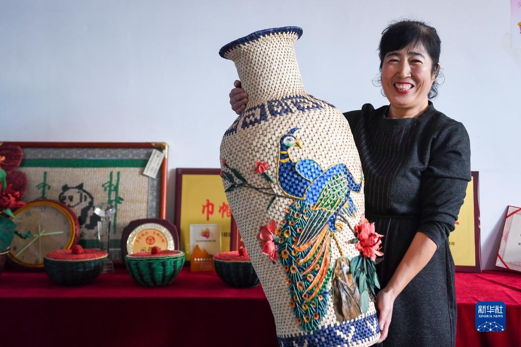 11月16日,在長(cháng)春市九臺區龍嘉巧姐草編農民專(zhuān)業(yè)合作社,閆金鳳展示草編工藝品。