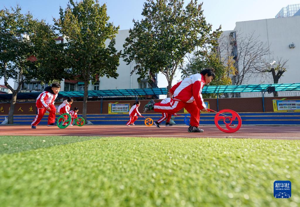 11月17日,河北省唐山市路北區光明實(shí)驗小學(xué)的學(xué)生利用課間時(shí)間玩滾鐵環(huán)。