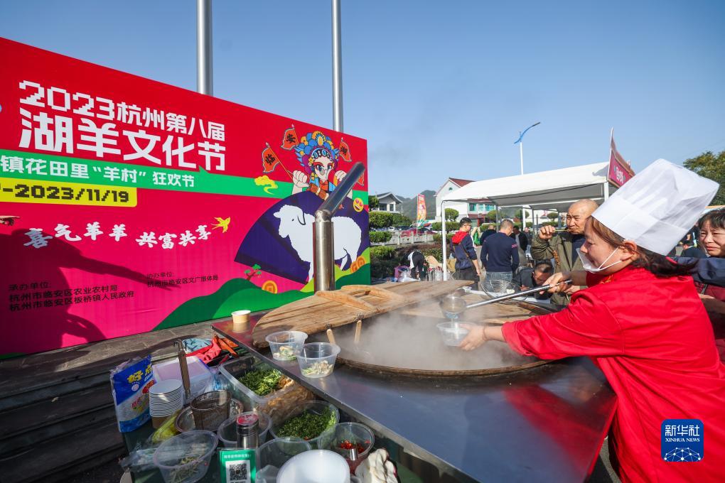 11月17日,商戶(hù)在板橋鎮花戲村的湖羊文化節鄉村市集上烹飪湖羊美食。