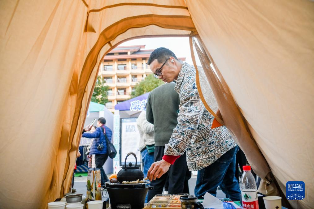 11月17日,在第四屆荊楚鄉村文化旅游節集市上,游客在體驗露營(yíng)圍爐煮茶。