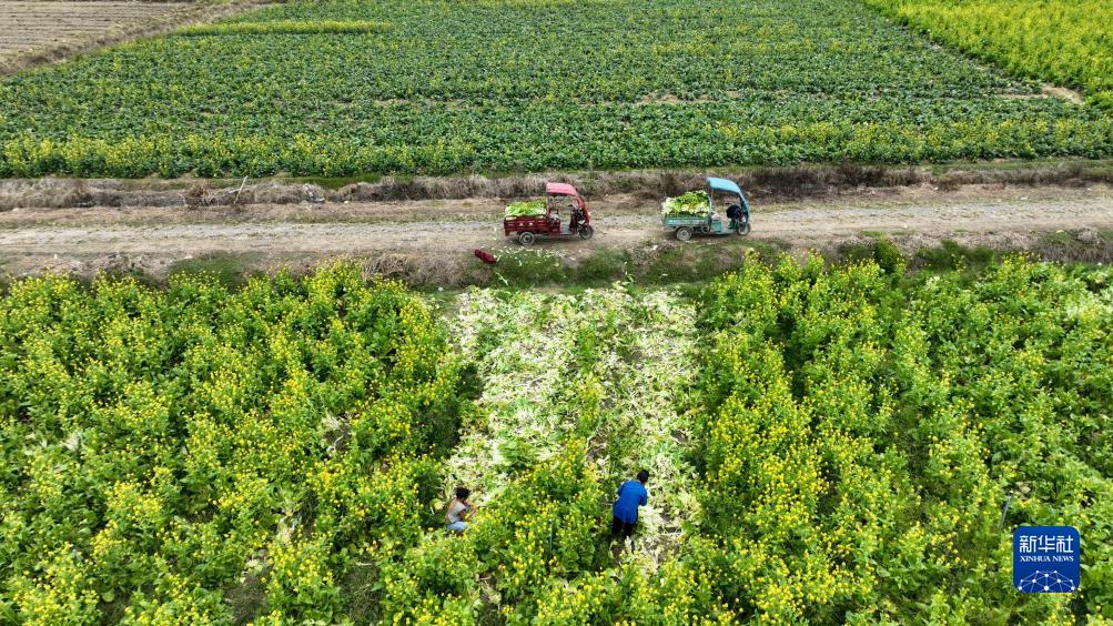 11月18日,村民在貴州省黔東南苗族侗族自治州榕江縣車(chē)江萬(wàn)畝大壩采收菜苔(無(wú)人機照片)。