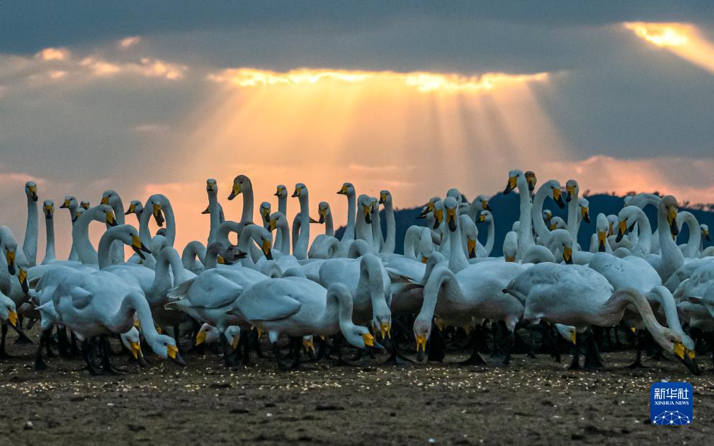 11月18日,在山東省榮成大天鵝國家級自然保護區天鵝湖湖畔,成群的大天鵝在漫步、覓食。
