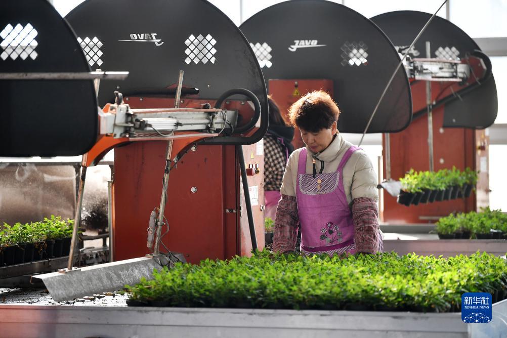 工作人員在寧夏銀川市興慶區農業(yè)高科技智慧示范園區花卉生產(chǎn)基地進(jìn)行花卉育苗工作(11月18日攝)。