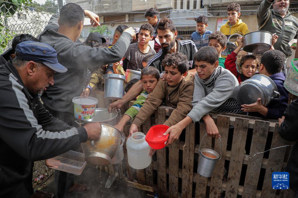 11月19日,在加沙地帶南部城市拉法,人們領(lǐng)取救濟食物。