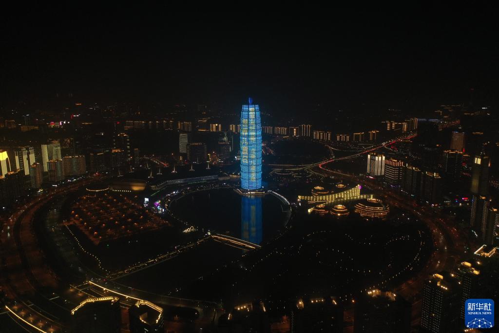 11月20日,鄭州市千璽廣場(chǎng)主樓為世界兒童日亮燈(無(wú)人機照片)。